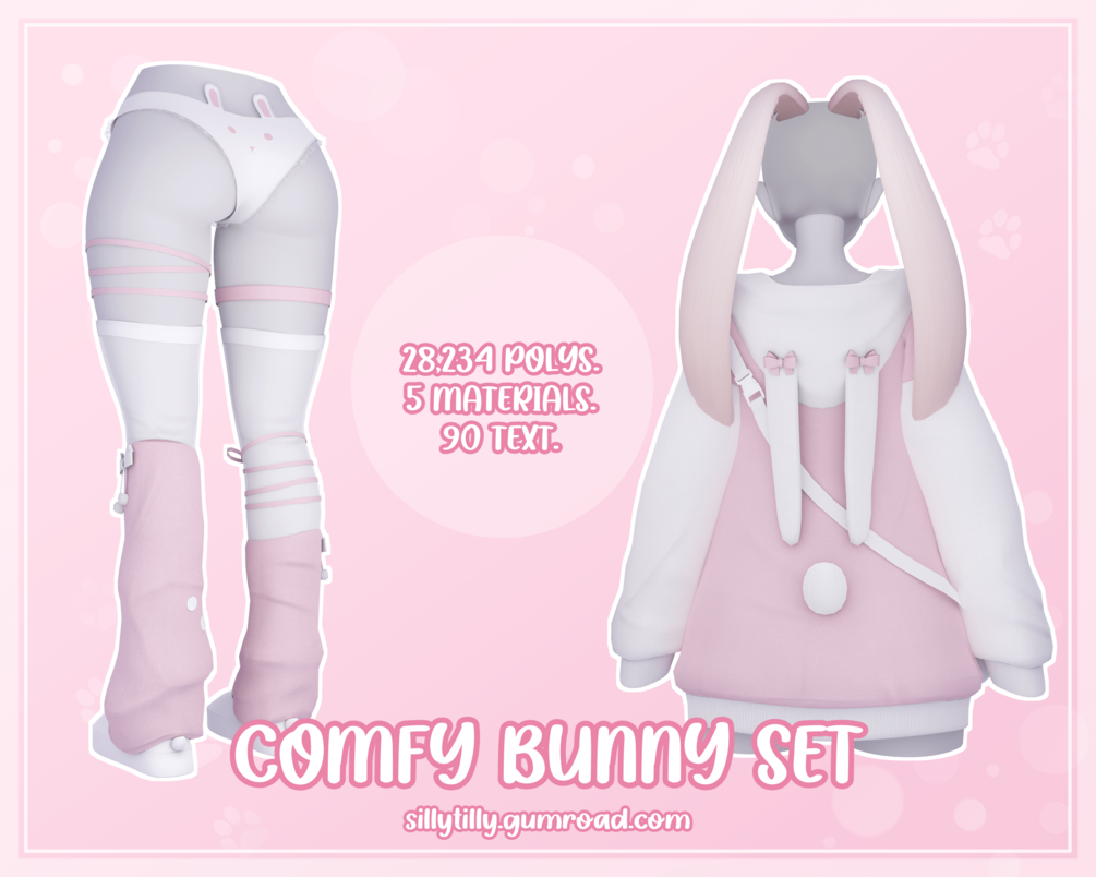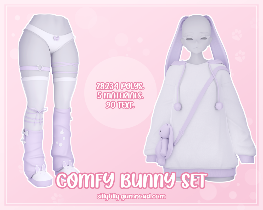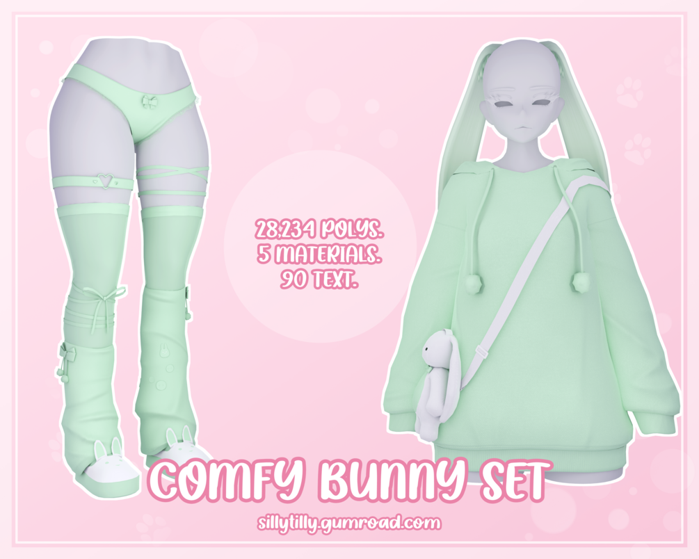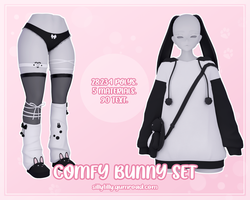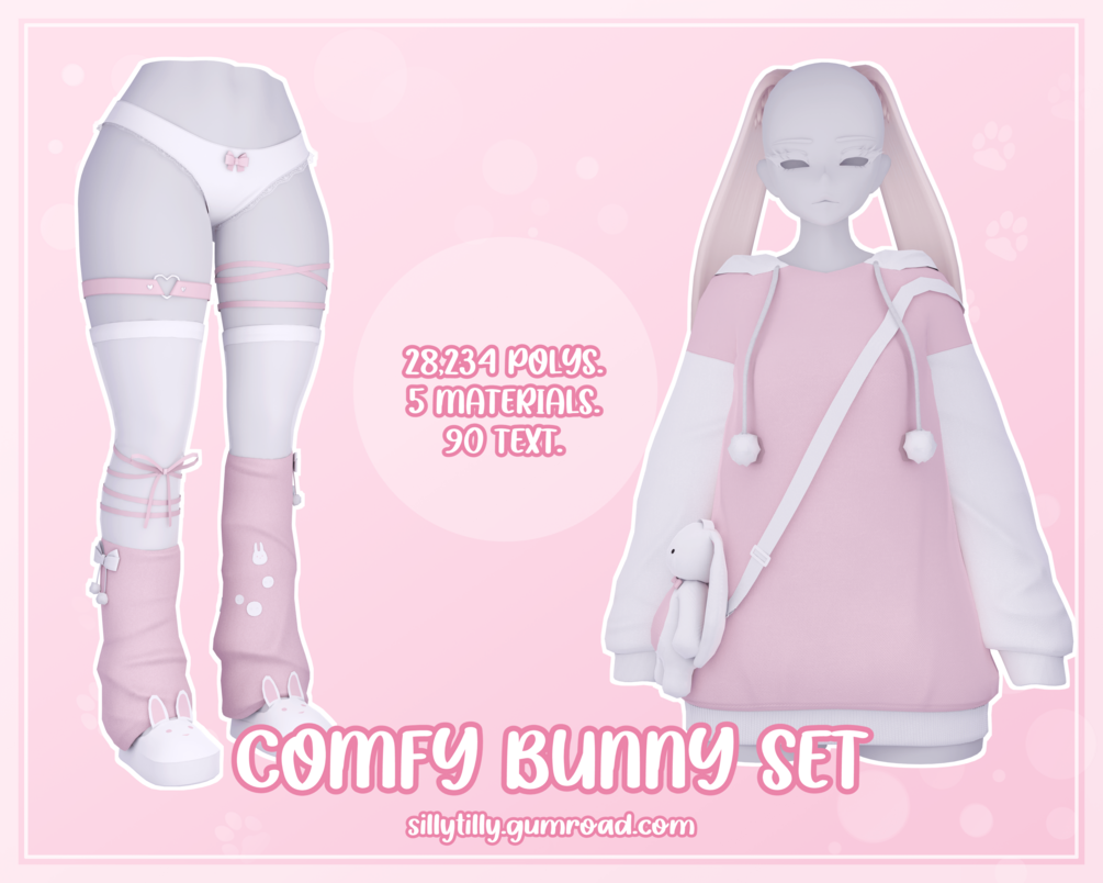 ╰┈➤ 5 materials (hoodie, bow bottoms + leg warmers + thigh highs, bunny ears, bunny bag, slippers).