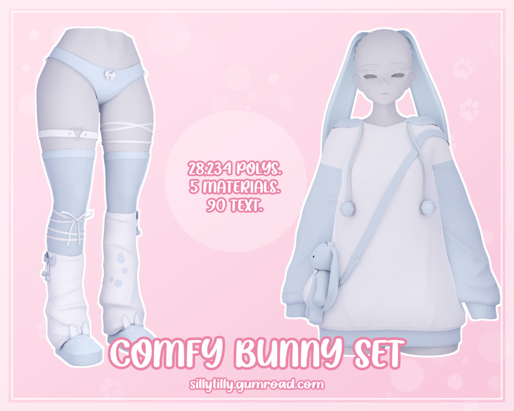 ╰┈➤ 5 materials (hoodie, bow bottoms + leg warmers + thigh highs, bunny ears, bunny bag, slippers).